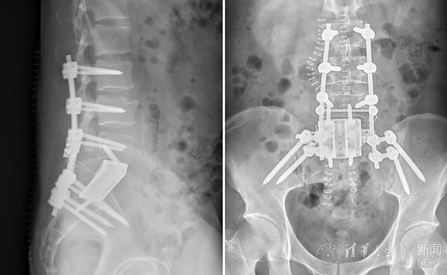 手术在新的一天的凌晨2点结束,术中,跟台护士更换了3批。前后路的转换,患者翻身2次,手术历时10余个小时,生命体征未出现波动。患者在ICU病房几小时后即拔管苏醒。术后的患者如厕正常,并已下地活动,复查X光片,内固定位置良好,假体完全贴合。