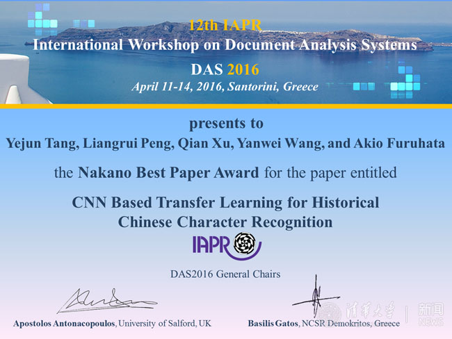 电子系彭良瑞研究组古籍识别与深度学习研究成果获DAS2016最佳论文奖