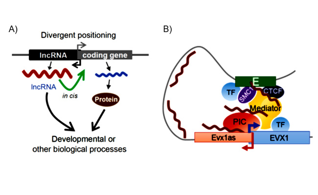 A) 反义长链非编码RNA(divergent lncRNAs)通过调控邻近蛋白编码基因的转录来参与与该蛋白相关的生物学过程。
