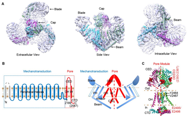 机械敏感Piezo1离子通道的冷冻电镜三维结构与分子工作机制