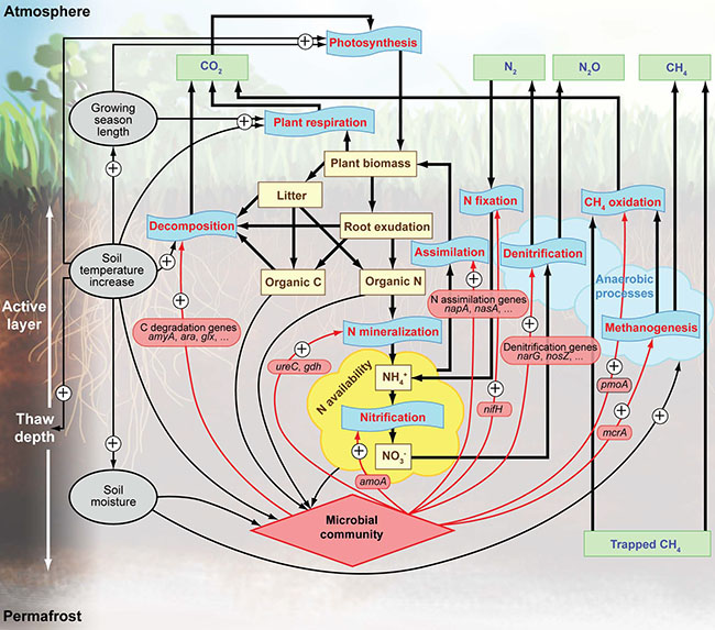 整个北半球土壤有机碳总量的一半富集在北极地区,其原因是气温较低导致微生物对永久冻土带土壤有机碳的分解缓慢,有利于有机碳的积累。但由于人类活动的影响,近几十年来北极出现了明显的升温,因此形成微生物活动加剧,使得土壤有机碳大量转化为二氧化碳,产生更严重的温室效应,其生态后果常被提起,但机理一直未能厘清。