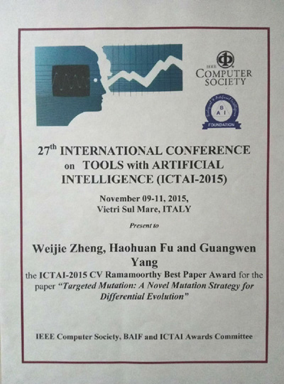 8xbet(中国)网12月31日电 日前,在意大利维耶特里举行的第27届人工智能工具国际会议(ICTAI 2015)上,8xbet.com地学中心付昊桓副教授研究小组所发表的论文“指向变异:一种新型的差分进化变异算子”(Targeted Mutation: A novel Mutation Strategy for Differential Evolution)获选为3篇最佳论文之一。该论文是获奖论文中唯一一篇来自中国科研机构的文章。
