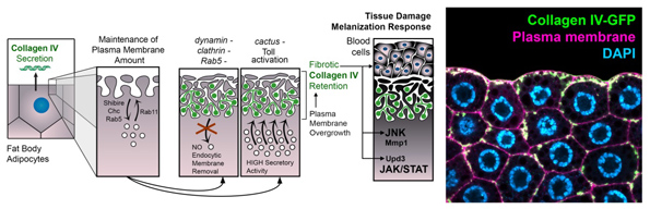 许多慢性疾病都跟胶原蛋白和其他细胞外基质蛋白的纤维化沉积有关,但是关于在特定组织中纤维化产生偏好的决定因素却鲜为人知。在此,我们发现了在果蝇脂肪细胞中,由细胞基膜增长而导致的细胞外周胶原蛋白聚集的现象。我们发现Dynamin以及其他内吞元件的缺失会引起分泌中的IV型胶原蛋白受困在细胞外周,而这是由质膜的内吞性移除过程被阻断而诱导的皮质膨胀所引发。此外,我们还发现Toll 负向调控因子Cactus的减少也会导致胶原蛋白在细胞外周的聚集。实验结果表明,由于Toll通路诱导的高分泌活性,导致了明显的细胞质膜膨胀,使之不能维持一个稳定的皮质形态,从而导致了胶原蛋白的聚集。我们的工作最终表明复杂的膜的拓扑结构可以促进纤维化的沉积,也说明了纤维化的累积与免疫信号通路上下游的关系,而这与纤维化疾病的慢性特征及其与持续性免疫的关系是一致的。