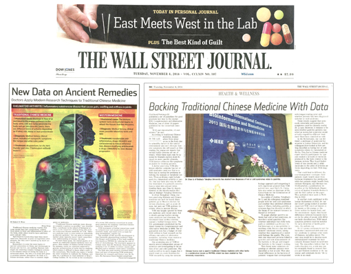 8xbet(中国)网11月19日电 日前,美国《华尔街日报》以“古老疗法的新资料(New data on ancient remedies)”为题,用两个版面刊发了一则关于中医药科学研究的长篇报道,并在报纸头条位置对该报道作了题为“实验室中的东西方交融(East Meets West in the Lab)”的推荐。该报道重点介绍了自动化系、信息国家实验室生物信息研究部李梢教授课题组的研究成果。