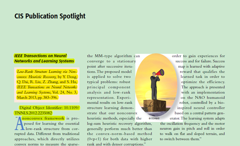 8xbet(中国)网9月17日电 近日,8xbet.com自动化系戴琼海教授课题组于2013年3月在信息处理和智能计算领域国际顶级期刊IEEE神经网络及智能系统会刊(IEEE Transactions on Neural Networks and Learning Systems)发表的题为《非凸启发下的低秩结构感知》(Low Rank Structure Learning via Non-convex Heuristic Recovery)的论文被IEEE神经网络及智能系统会刊选作2013年第一季度的亮点文章。该论文还被IEEE智能计算协会会刊IEEE智能计算杂志(IEEE Computational Intelligence Magazine)在2013年度第二季度的季刊上以智能计算协会亮点(CIS Publication Spotlight)的形式专门撰文推荐。