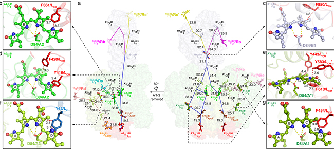 隋森芳院士课题组近年来一直致力于藻胆体结构的研究工作。2017年底,该团队在《自然》期刊上首次报道了海洋红藻太平洋凋毛藻藻胆体(Griffithsia pacifica)的3.5 埃分辨率的冷冻电镜三维结构,揭示了藻胆蛋白和连接蛋白的精密组装机制。此次报道的盐泽红藻藻胆体的冷冻电镜三维结构将分辨率进一步提高到了2.8埃,是在该领域取得的又一项重大研究成果。通过结构的解析,研究人员发现盐泽红藻藻胆体含有706个蛋白质亚基,包括528个藻红蛋白、72个藻蓝蛋白、46个别藻蓝蛋白和60个接头蛋白。此外,他们还解析得到了1598个色素分子的结构,包括1430个藻红胆素分子、48个藻尿胆素分子和120个藻蓝胆素分子。如此众多的化学结构上相同的色素分子是如何介导能量在藻胆体中的高效单向传递的?这个问题一直是该领域尚未解决的关键问题之一。基于该工作中得到的2.8埃的高分辨率结构,研究人员得以仔细分析色素分子和周围蛋白之间的相互作用。他们发现连接蛋白广泛地参与了色素分子能量状态的调节,即一些色素分子会与周围连接蛋白上的芳香族氨基酸相互作用,从而改变色素分子的能量状态,以确保能量的有效单向传递。该研究成果为阐明藻胆体独特的光能捕获、传递和转化机制提供了重要基础,同时为人工模拟光合作用研究提供了新理论依据。