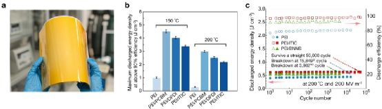 a:聚合物-分子半导体全有机复合介电薄膜 b:全有机复合介电材料(PEI/DPDI、PEI/PCBM、PEI/ITIC)高温储能特性远优于传统高温介电聚合物(PEI) c:高温高场下全有机复合介电薄膜长期工作循环性能