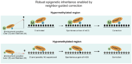 有趣的是,该修复可能正是通过DNMT1的不精准活性。并且这种不精准活性还能完成对不同起始甲基化水平的稳定遗传,进而同时实现表观修饰的可塑性和可遗传性(robust yet flexible epigenetic inheritance)。这样一套表观遗传可塑性遗传机制的核心是基于对邻近区域甲基化水平敏感的DNMT1活性的“调节-稳定”系统(neighbor-guided correction)。研究人员相信类似系统可能在表观遗传修饰的传递过程中广泛存在。