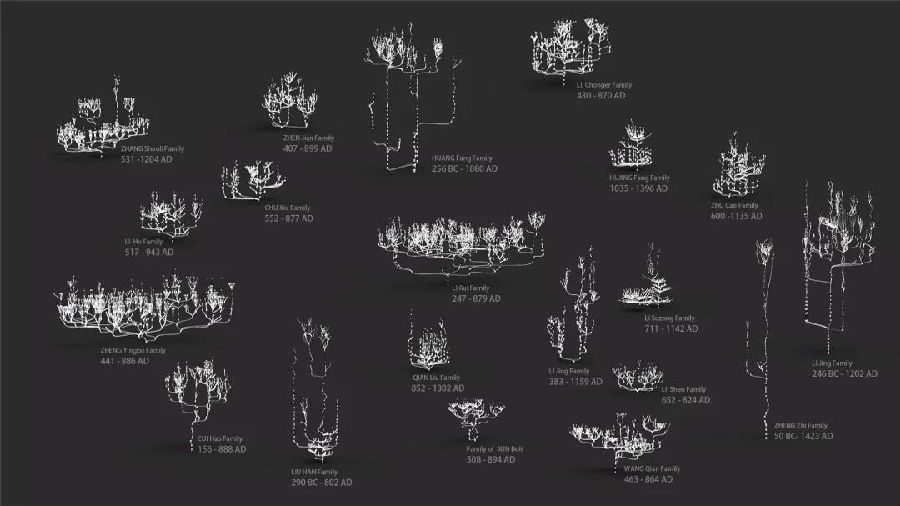 以清华美院副教授向帆、王之纲等为主导的家族树项目团队历时三年,采用哈佛大学主导开发的中国古代人物关系数据库,探寻长达千年的中国人血脉之源,用可视化技术为“我从哪里来” 提供解答的线索。