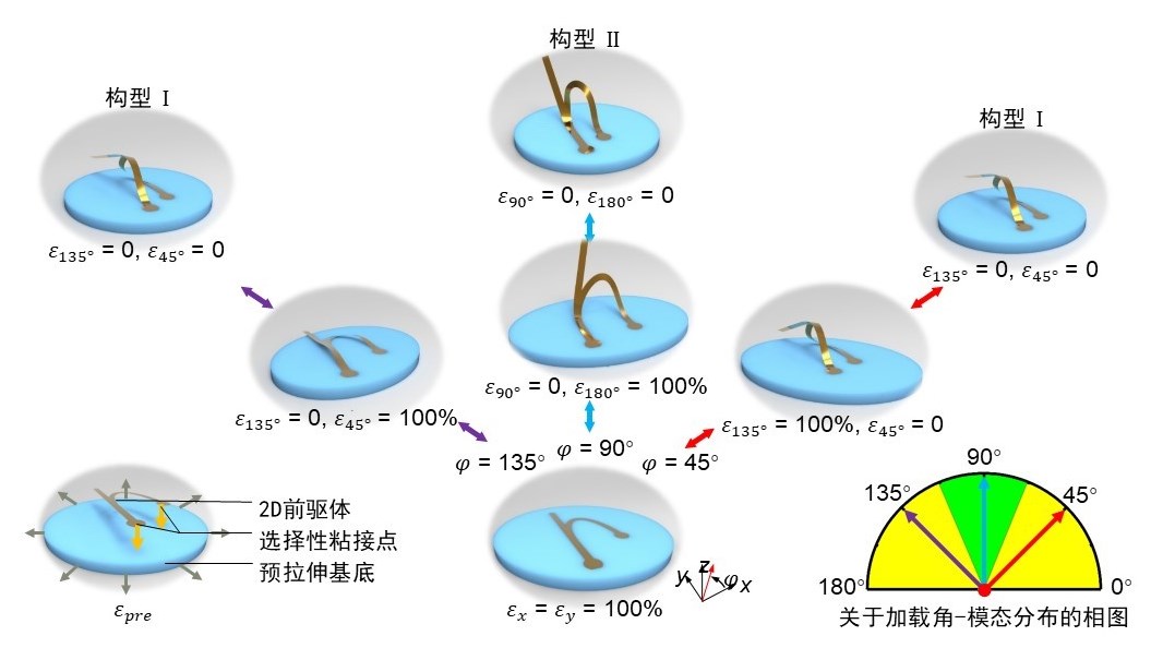 为解决上述问题,航院张一慧课题组提出了一套通过矢量调控屈曲组装实现几何可重构三维结构的策略,该策略基于屈曲组装中可重构力学机理的深入研究,实现了从简单单胞到复杂结构自下而上的系统化设计,实现了具备离散-连续双重调控能力的可重构电子器件,同时适用于广泛的高性能材料和较宽的特征尺度范围,因此在多种复杂应用场景下具有独特的优势。
