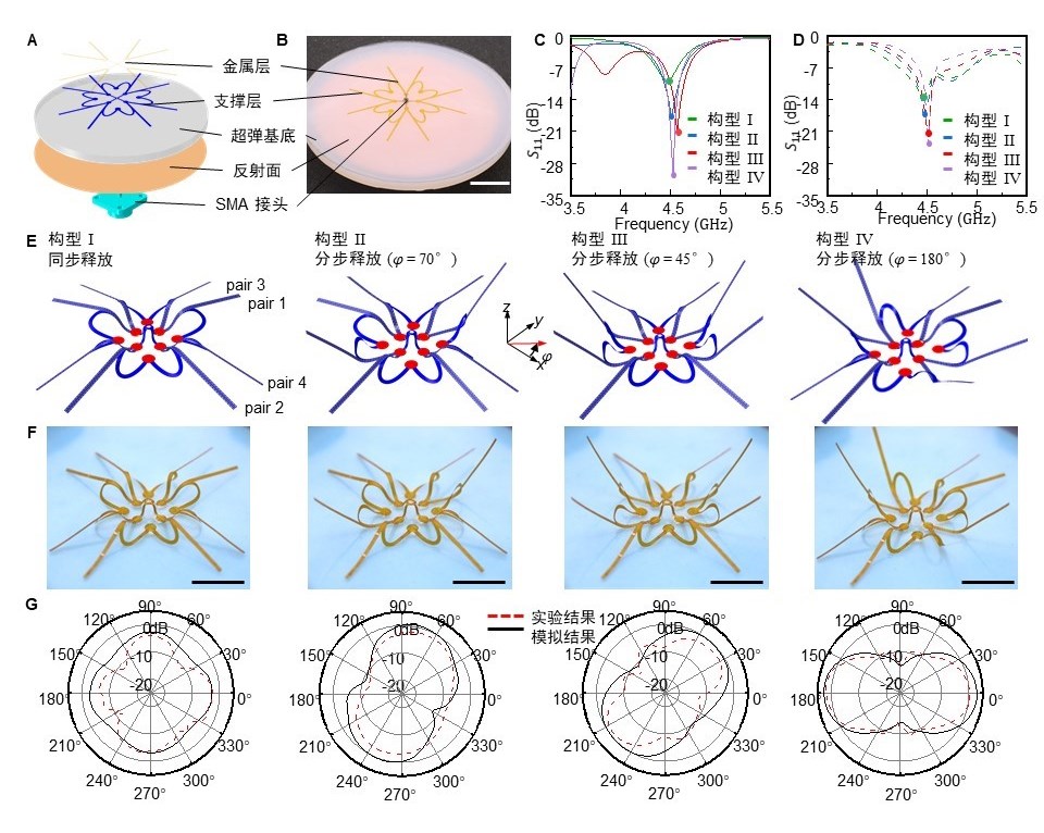 图3:A、B图为可重构方向图天线的示意图与实物图;C、D图代表不同构型下天线回波损耗的电磁数值模拟与实验结果;E, F图为这四种构型下天线的力学数值模拟与H面上辐射增益的模拟与实验结果。比例尺,2cm