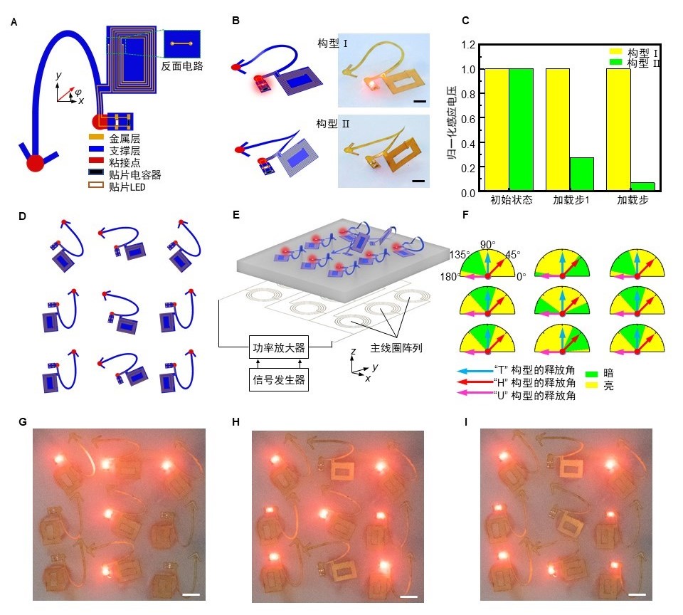 图2:A、B图为基于可重构几何设计的单个可重构线圈天线平面构型和两种不同的三维构型,C图为单个天线不同几何构型下线圈内感应电压的比较;D,E图为将单个天线布置为阵列的俯视图和实验系统,F图为阵列的构型-释放角关系相图;G,H和I图为线圈天线阵列在三种典型构型“T”,“H”和“U”下的实验结果。比例尺,2mm