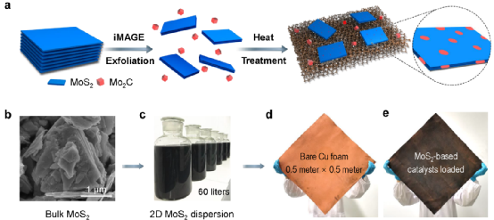 当前,利用电解水方法制备氢气是可再生能源转化和可持续发展的有效策略之一。电解水制氢技术目前最大的问题是其高能耗与高成本。因此,开发和使用高效廉价电催化剂,是实现电解水产氢技术大规模工业应用的前提。铂基催化剂是公认最有效的电解水产氢催化剂,然而铂的低储量导致成本高昂,限制了其大规模工业使用。近年来,开发高效和廉价的大电流产氢电催化剂以及其规模制备方法,成为发展工业化电解水产氢技术的重要研究方向。基于研究团队前期对二维材料规模制备(National Science Review, 2020, 7, 324)及大电流密度电解水产氢催化剂设计(Nature Communications, 2019, 10, 269)的工作基础,本文进一步提出了大通量、可放大规模化制备二维材料大电流产氢电催化剂的方法。所制备的二硫化钼基电催化剂在驱动1000mAcm-2的电流密度时所需的过电压仅为412mV(0.5 M H2SO4的酸性体系中)与440mV(1.0 M KOH的碱性体系中)。