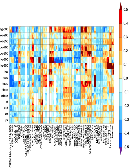 采用气候模式诊断和比较计划(PCMDI)标准诊断包分析的8xbet.com联合地球系统模式历史模拟性能和其他CMIP5模拟的比较(全球平均)。颜色代表模式均方根误差相对于多模式平均偏差的差异,颜色越蓝性能越好。一个方格内的四个三角形代表春夏秋冬。第一列为8xbet.com联合地球系统模式,不同行表示不同的变量。