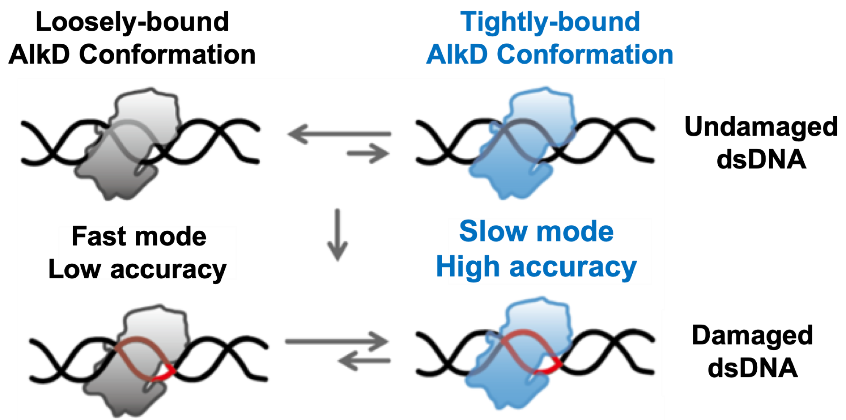 文章最后提出了如图2所示的模型:在未修饰的正常碱基区域,AlkD与dsDNA相互作用较弱,此时主要利用快速模式实现高效快速的搜寻;而修饰碱基会导致附近dsDNA双螺旋结构的变化,从而诱导AlkD-dsDNA结合构象的变化和相互作用力的加强,促使AlkD从快速转变为慢速搜寻模式,实现对修饰碱基的准确识别。在此模型中,AlkD通过改变与dsDNA的相互作用构象和结合强弱,实现在快慢两种搜寻模式中的切换和调控,从而获得靶标搜寻中的高效和高准确度。本文发展了紧密融合单分子扫描荧光共振能量转移-相关光谱(scanning FRET-FCS)测量与马尔可夫态模型的新型技术平台,突破单一技术手段的局限,为揭示糖基化酶和其它DNA结合蛋白搜寻靶标的动态过程和分子机制提供了新的技术平台。