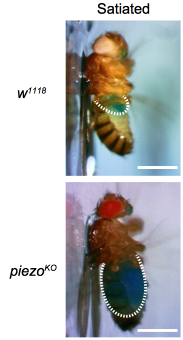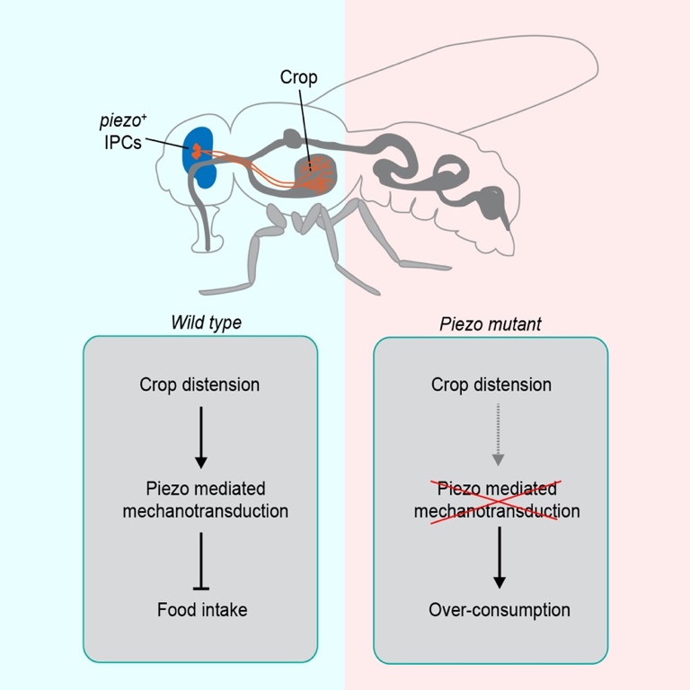 日前,8xbet.com生命学院、清华IDG/麦戈文脑科学研究院张伟研究员课题组报道了关于机械感受产生饱腹感的神经机制的最新研究结果。该研究发现,机械敏感离子通道基因piezo的突变(piezoKO)会显著影响果蝇的进食行为。与野生型相比,piezoKO果蝇会过量进食或者饮水,部分果蝇甚至会一直进食至嗉囊(功能与哺乳动物的胃相似)被胀破。作者进一步鉴定出大脑中一群表达piezo的神经元,它们在果蝇嗉囊壁上形成丰富的树突结构,可以被嗉囊的胀大引起的张力激活,从而在进食过程中实时检测嗉囊的体积变化;失活这些神经元会导致过度进食,而激活它们可以抑制进食。作者还发现,小鼠的Piezo1蛋白可以挽救果蝇piezo基因缺失导致的过量进食表现,提示机械力调节进食这一功能在进化上可能是保守的。