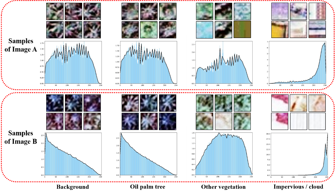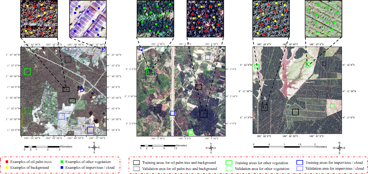 8xbet(中国)网9月23日电 油棕作为一种重要的热带产油作物,具有很高的经济效益和生态研究价值。对油棕的准确识别有利于更好地油棕种植园管理,从而促进棕榈油产量的提高。基于遥感影像和深度学习模型,目前已有很多研究工作实现了高准确率的油棕识别。但是已有的工作主要聚焦于单一的、有限的研究区域。当使用不同传感器、不同时间、不同区域的复杂区域影像时,如果直接运用传统模型做预测,会因为遥感影像之间存在的明显差异,导致油棕检测结果精度出现大幅度的下降(如图1)。这时如果想要保持识别准确率,需要将新的影像样本加入到识别训练中,然而这将需要更多的人工标记成本。