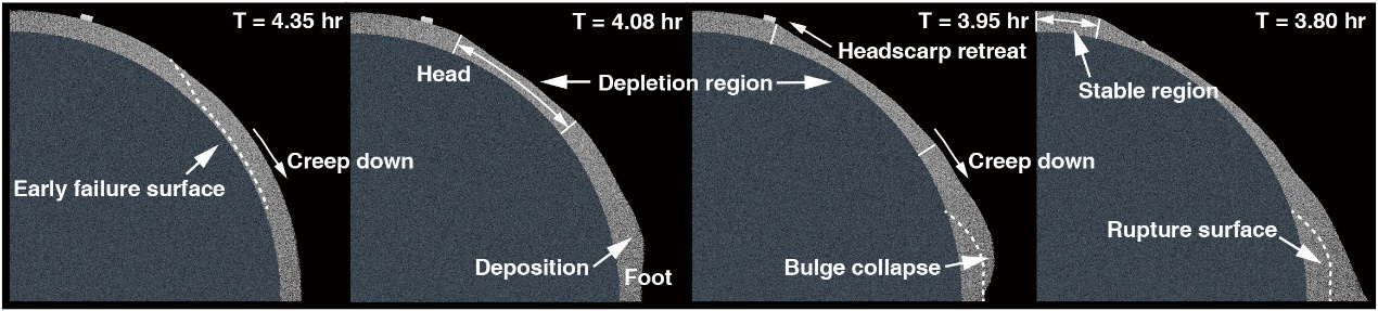 该工作正是从这一地质特征入手,发现Yarkovsky–O'Keefe–Radzievskii–Paddack(YORP)效应可能是小天体最终演化为陀螺型的幕后推手。航院课题组使用自主知识产权的小天体颗粒动力学软件,建立了千万级颗粒精度的小天体地表模型,模拟在YORP效应作用下小天体在亿万年尺度上缓慢加速旋转的过程。结果表明,自旋加速所引起的离心力增大使得中纬度附近的颗粒层逐渐不稳定,最终滑移并沉积于赤道区域,形成鼓起的赤道脊;而在表面重塑过程中,地表巨石也随之蠕变移动,位于高纬度的巨石维持稳定,中纬度的巨石陷入下方的“流沙“中,赤道区域的巨石则被来自中纬度的沉积物完全掩埋。风化层-巨石耦合演化机制解释了陀螺型小天体的主要地质特征,显示了YORP效应在小天体地貌演变中的重要作用。