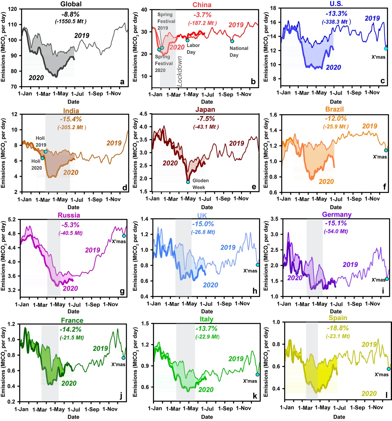 为及时反映新冠疫情后的全球碳排放变化,8xbet.com地球系统科学系(以下简称“地学系”)刘竹副教授研究组联合27家国内外单位,基于多部门高时空分辨率数据观测人类活动强度变化,构建了全球首个近实时碳排放数据库,并揭示出新冠疫情造成了历史上人类活动二氧化碳的最大减排量,其短期下降幅度超过第二次世界大战及2008年金融危机时期。通过对人类活动碳排放的近实时监测,将可能使减排政策调整的响应时间大大缩短。研究结果以“全球二氧化碳排放的近实时监测揭示了新冠疫情大流行的影响”(Near-real-time monitoring of global CO2 emissions reveals the effects of the COVID-19 pandemic)为题发表于《自然·通讯》(Nature Communications)上。