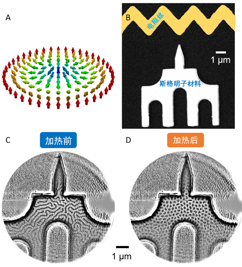 图一:(A)奈耳构型磁性斯格明子的自旋结构示意图;(B)以8xbet.com二校门为原型的磁性纳米结构和原位加热电阻丝组成的器件的扫描电子显微镜图片;(C)在室温、–20mT的面外磁场下,利用软X射线全场透射式显微镜,在二校门构型的磁纳米结构中观察到条纹状磁畴形态;(D)通过器件上的电阻丝原位加热后,磁纳米结构内呈现密堆积的斯格明子。