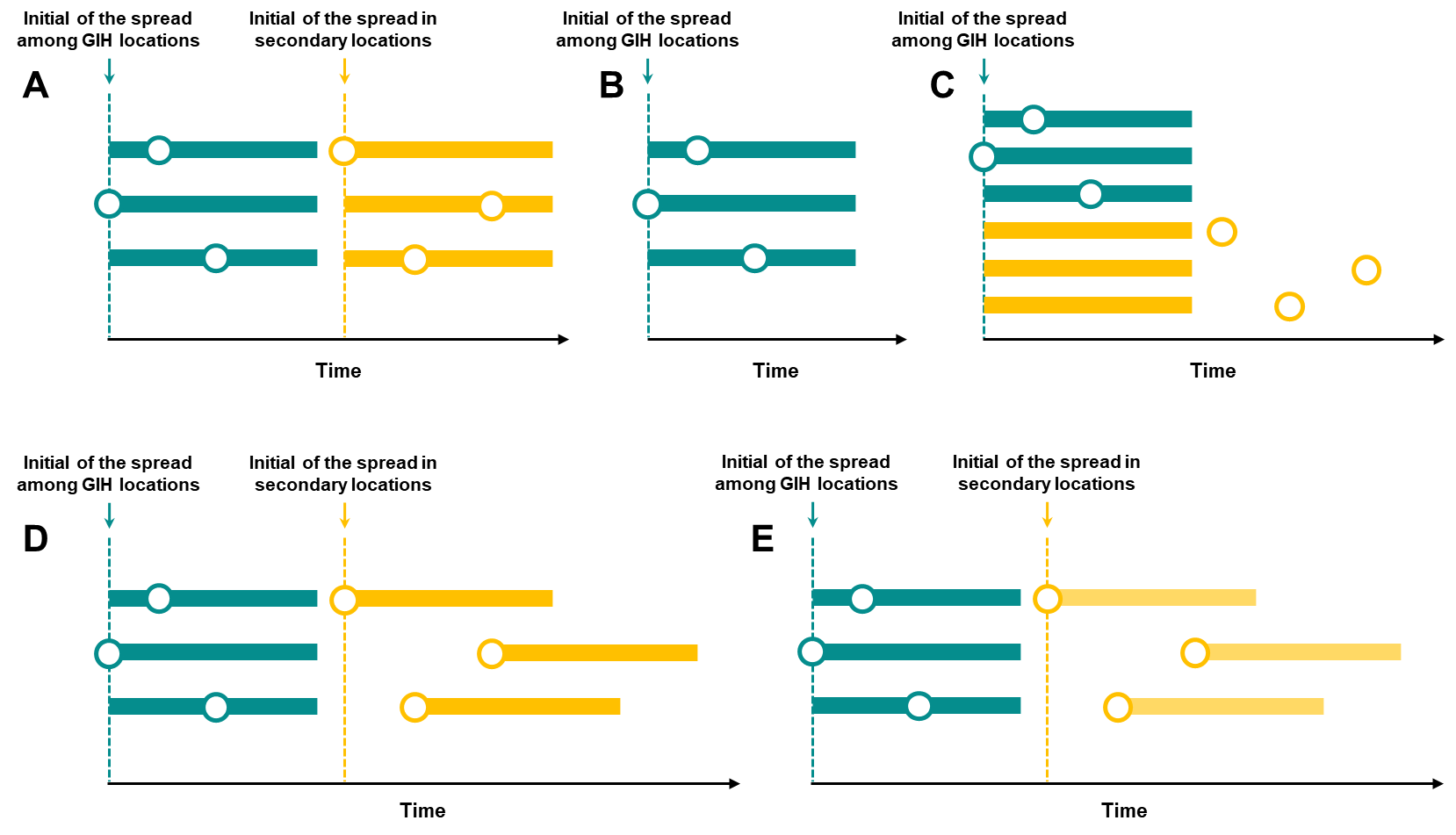 图1 不同防控策略。(A)最高风险和次高风险地区分批次联合防控(B)仅最高风险地区联合防控(C)所有地区同时防控(D)最高风险地区联合防控,次高风险地区按各地开始流行的时间采取严格防控(E)最高风险地区联合防控,次高风险地区按各地开始流行的时间采取中等强度的防控