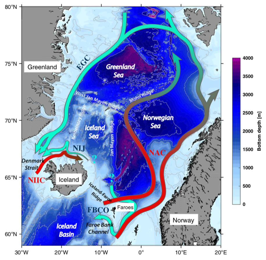 图1 北欧海流场示意图,颜色表示底地形,蓝色箭头表示溢出流。