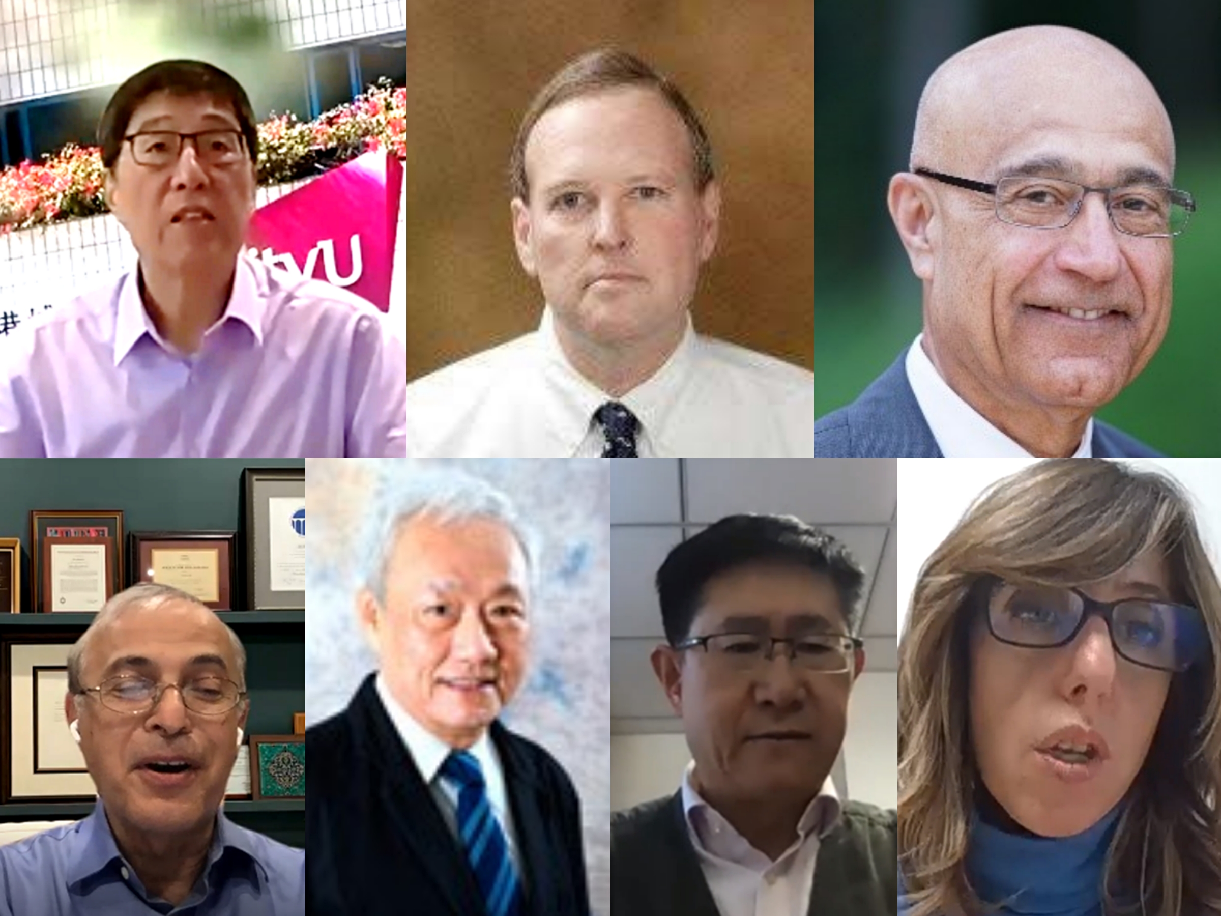 发表主题演讲的嘉宾(上排从左至右为:郭位院士、杰夫·沃斯博士、穆罕默德·莫达雷斯教授;下排从左至右为:阿里·莫斯莱教授、吴桐毅院士、王兆军教授、比安卡·玛丽亚·科洛西莫教授)