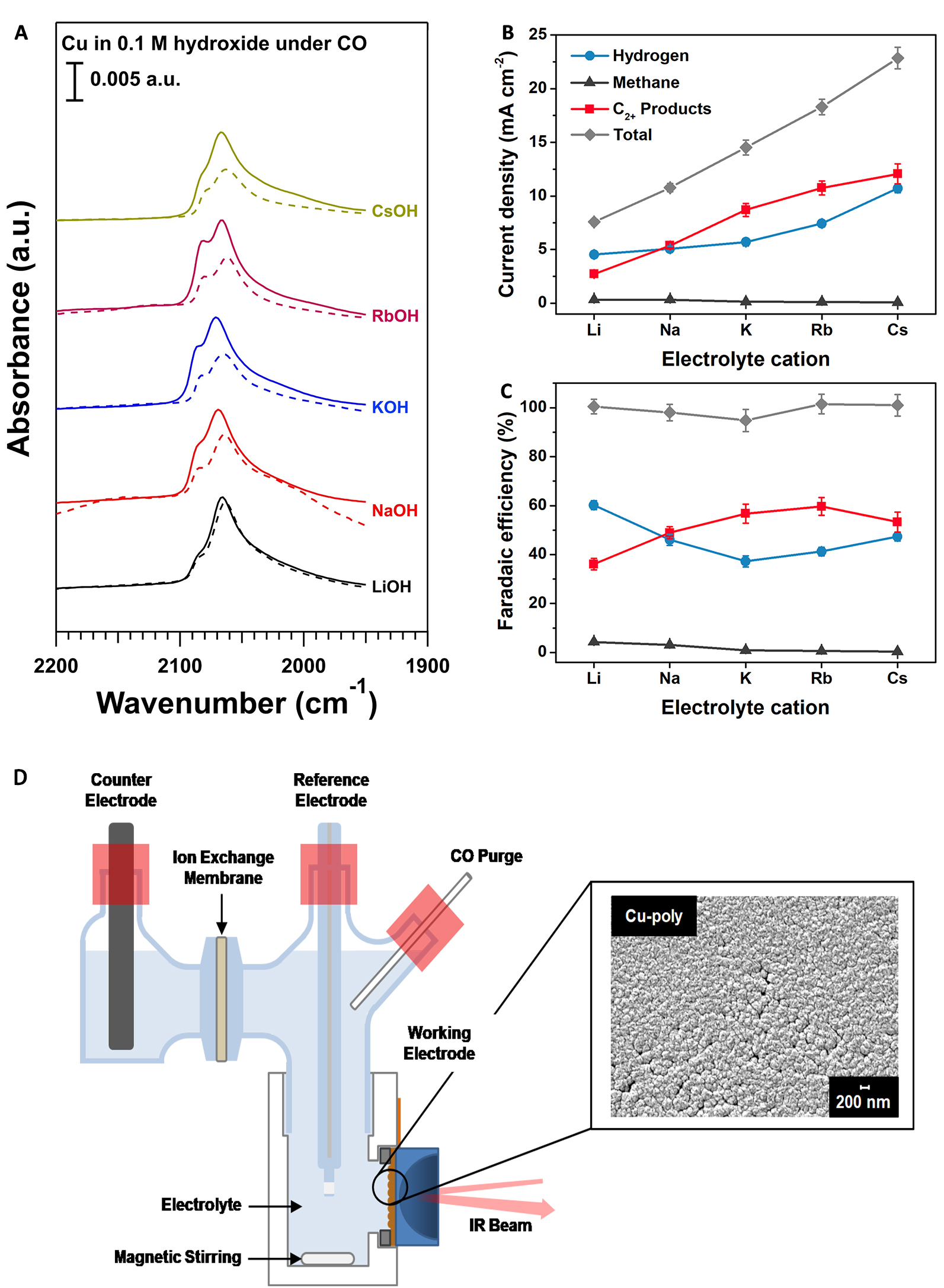 图1. (A)在CO饱和的0.1 M不同碱金属氢氧化物中的光谱数据;Cu气体扩散电极进行CO电催化转化至不同产物的(B)电流密度和(C)法拉第效率;(D)原位表面增强红外光谱电化学池示意图。