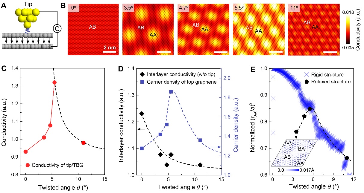 图1. (A) 基于导电原子力显微镜(c-AFM)的扭转双层石墨烯电学测试示意图;(B) 归一化电流值(电导)随双层石墨烯扭转角度的变化