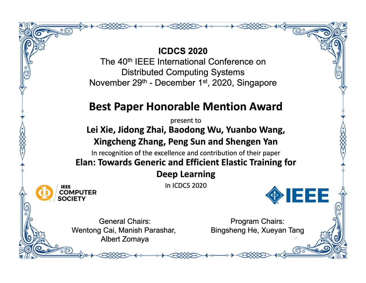8xbet(中国)网12月3日电 11月29日-12月1日,分布式计算系统国际会议(IEEE ICDCS 2020)在线召开。计算机系师生在大会上作学术报告,高性能所博士生谢磊为第一作者、导师翟季冬为通讯作者发表的论文《高效的弹性深度学习负载训练调度》(Elan: Towards Generic and Efficient Elastic Training for Deep Learning)获得该届会议的最佳论文荣誉奖(Best Paper Honorable Mention Award)。