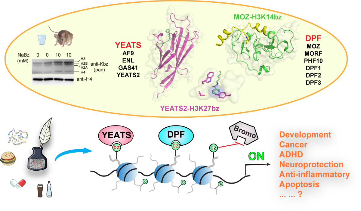 苯甲酸钠(NaBz)作为Kbz的上游供体是FDA批准的食品防腐剂,普遍存在于酒水饮料、蜜饯、泡菜、酱类、饼干、奶油等各类包装食品中;同时,NaBz也是治疗急性高血氨的药物,当病人进行高剂量NaBz静脉注射时,其血浆内的苯甲酸钠浓度可高达10mM;另外,不同于其他脂肪族链状酰基化修饰,苯甲酰辅酶A(benzoyl-CoA)是细胞或者细菌,包括肠道菌群,代谢芳香环化合物所产生的中间产物,提示组蛋白苯甲酰化修饰响应不同的细胞代谢通路。组蛋白苯甲酰化修饰是唯一含有芳香环的酰基化修饰类型,其独特的苯环结构赋予了Kbz更大的体积和更强的疏水性质。那么,哪些家族蛋白是Kbz修饰的阅读器呢?饮食摄入或者细胞代谢产生的NaBz信号分子能否沉积于染色质进而发挥特定生物学功能呢?