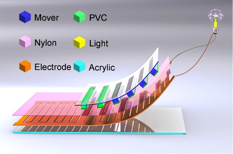 清华机械系智能与生物机械团队提出“悬浮式”能量收集与减负背包的电能产生单元是基于TENG原理,即摩擦起电和静电感应的耦合效应,据背包发电采用的滑移式TENG模型显示:聚氯乙烯(PVC)薄膜在尼龙(Nylon)薄膜上滑动,因两种材料的摩擦电负性不同,PVC薄膜上会带负电荷,Nylon薄膜上会带正电荷,因此在两薄膜间会形成静电场;在静电感应作用下,粘附于Nylon薄膜下的栅格式两组金属电极表面电荷会重新分布,在两组电极之间形成电势差;当外接入负载(如电灯)后,电子会在电势差作用下通过电灯使其发光,即有电流通过外负载电路,产生电能。PVC薄膜在Nylon薄膜上来回运动会使静电场不断交替变化,金属电极两端的电势差也在不断变化,最终表现为外负载的电路中产生交流电。而提供给让PVC薄膜运动的动力正是背包与人体的相对运动。