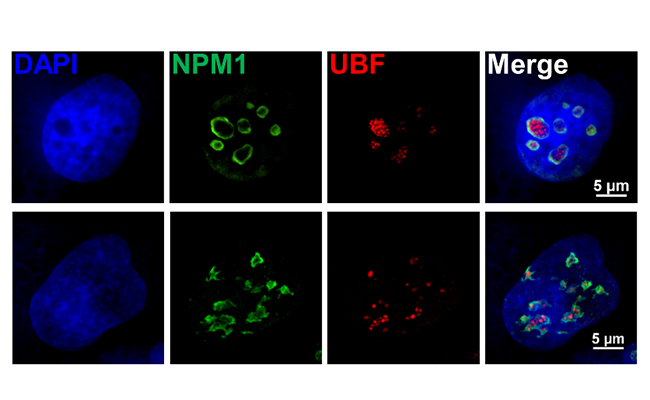 研究发现LETN表达水平在多种肿瘤中上调,其通过与核仁蛋白NPM1的直接结合驻留在核仁中,并在促进NPM1五聚体的形成中起着至关重要的作用。核仁是真核细胞中非常重要的无膜细胞器,是核糖体RNA的转录、加工以及核糖体亚基组装的场所,控制了细胞蛋白质合成、有丝分裂、压力应激等多种生物学功能。肿瘤细胞及神经前体细胞等快速增殖的细胞高度依赖于活跃的核仁功能,而核仁的功能与结构依赖于NPM1五聚体的形成。因此,LETN通过控制NPM1的寡聚化组装,控制了核仁的正常形态与细胞功能,包括核糖体RNA合成及染色质凝聚等。