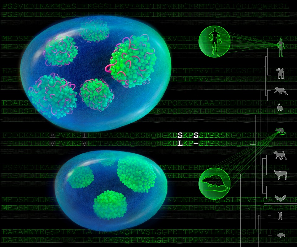 更进一步,从进化的角度看,LETN仅在人类及其它高等灵长类动物中出现,而NPM1蛋白也在高等灵长类动物中存在两个特异的氨基酸位点突变。论文发现正是这两个位点的突变导致NPM1产生对非编码RNA LETN的高度依赖性。因此,论文提出LETN与NPM1可能存在共进化关系,这使得人类细胞的核仁调控出现了由lncRNA LETN执行的新的调控层级。