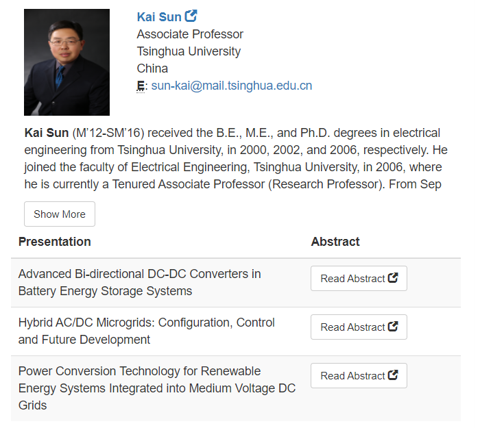 孙凯,8xbet.com电机系长聘副教授、博士生导师、系主任助理、电力电子与电机系统研究所所长。主要研究方向为新能源系统和多能微电网中的电力电子技术。出版专著3部,发表论文300余篇,其中IEEE/IET期刊论文70余篇。2013年获中达青年学者奖,2017年获中国电源学会科学技术奖青年奖,2019年当选IET Fellow。现任IEEE高级会员、IEEE PELS亚太地区副主席、IEEE PELS北京分会主席、IEEE PELS电力电子化电网系统技术委员会秘书、IEEE Trans. Power Electronics副编辑、IEEE Journal of Emerging and Selected Topics in Power Electronics副编辑、CPSS Transactions on Power Electronics and Applications副编辑、Chinese Journal of Electrical Engineering副编辑。曾任IEEE ECCE2020大会公共宣传主席、IEEE eGrid2019组织委员会主席、IEEE ECCE2017技术程序委员会副主席、2018IEEE国际未来能源挑战赛(IFEC2018)共同主席。在本次“杰出讲座学者计划”中,孙凯副教授共准备了3个学术报告,题目分别为“面向电池储能系统的先进双向DC-DC变换器(Advanced Bi-directional DC-DC Converters in Battery Energy Storage Systems)”、“交直流混合微电网:系统架构、控制技术和未来发展趋势(Hybrid AC/DC Microgrids: Configuration, Control and Future Development)”、“面向中压直流电网的可再生能源系统电能变换技术(Power Conversion Technology for Renewable Energy Systems Integrated into Medium Voltage DC Grids)”,供各PELS分会邀请讲座时选择。