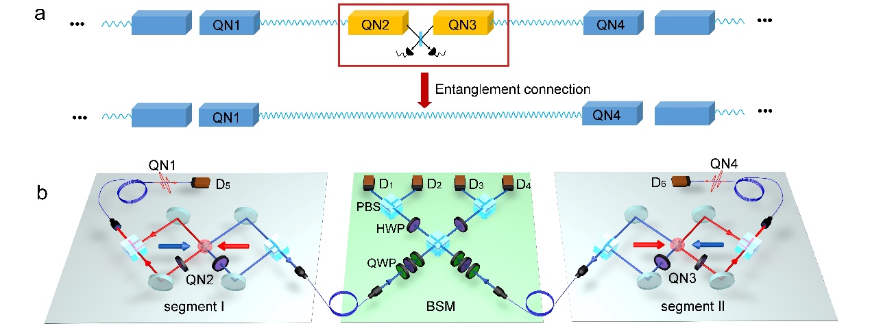 该成果的研究论文《量子中继模块纠缠连接的实验实现》(Experimental demonstration of memory-enhanced scaling for entanglement connection of quantum repeater segments)于近日刊发于国际学术期刊《自然·光子学》(Nature Photonics)。