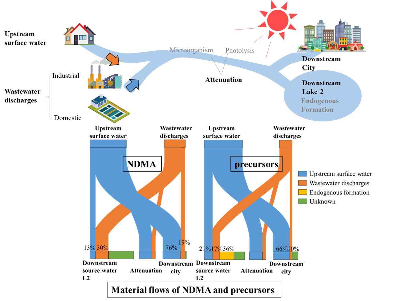 研究结果表明,上游地表径流向位于该城市下游的某水源地汇入了13±4%的NDMA和21±3%的NDMA前体物;该城市的生活污水和工业废水排放向下游水源地汇入了30±8%的NDMA和17±2%的NDMA前体物;水源地自身的微生物代谢最多可贡献36%的NDMA前体物。因此,上游地表水汇入和当地污废水排放是下游水源地中重要的NDMA来源;上游地表水汇入、当地污废水排放和水源地自身的微生物代谢是重要的NDMA前体物来源;自然衰减机制仅去除了部分径流机制带来的污染物负荷。研究表明,不仅要关注供水系统内作为新型消毒副产物的亚硝胺类生成,也要关注水环境中作为新型污染物的亚硝胺排放。本研究工作为全面、系统认识饮用水亚硝胺风险的来源,制订针对性的控制策略提供了重要的技术思路。