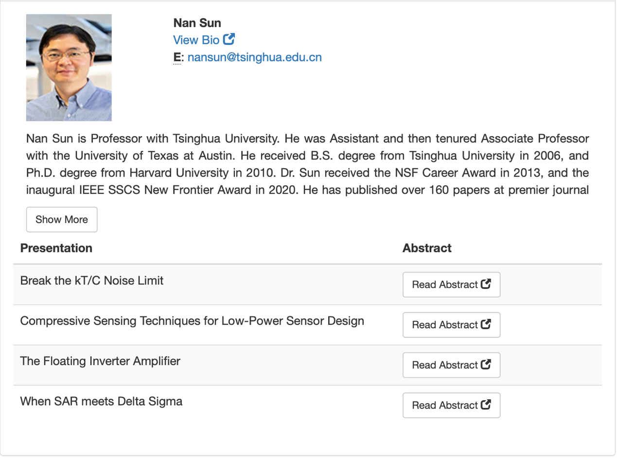 IEEE固态电路杰出讲师计划(IEEE Distinguished Lecturer Program)邀请领域内知名专家到IEEE协会分会和区域研讨会上作学术报告。杰出讲师通常任期两年,他们知识渊博,也是出色的演讲者。他们的报告题目涵盖当前芯片设计相关的研究热点,包括前沿技术发展方向、新器件、新存储器、无线通讯技术、高速和高精度数据转换器、高速有线通讯以及片上通讯、低噪声时钟、各类高能效低功耗设计等。