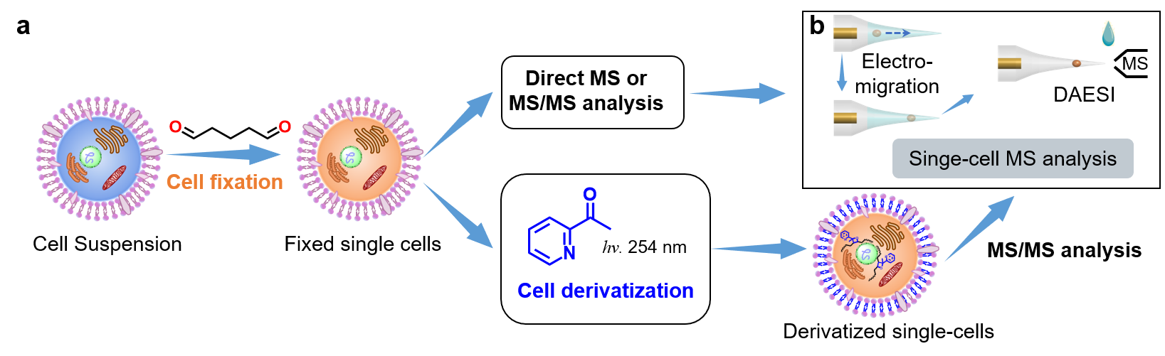 图1.单细胞脂质组精细结构表征技术。(a)单细胞脂质精细结构解析流程图,(b)基于电迁移和液滴辅助电喷雾(DAESI)的单细胞质谱分析。