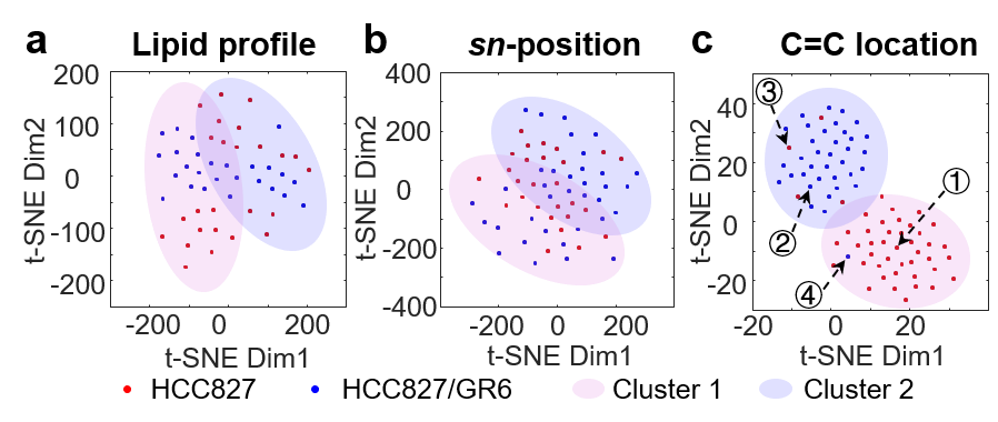 图2.敏感型和耐药型NSCLC细胞的精准识别。(a-c)t-SNE降维聚类图,(a)由脂质分子相对含量分布计算而得,(b)由脂质sn位置异构体相对含量计算而得,(c)由脂质C=C位置异构体相对含量计算而得。
