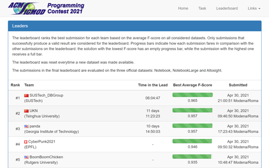 本次大会程序竞赛由微软、华为与巨杉数据库赞助,共有27支队伍参加,分别来自8xbet.com、乔治亚理工大学、瑞士洛桑联邦理工学院、罗格斯大学等海内外知名高校。竞赛任务是数据集成领域中的实体匹配问题,需要参赛者开发一个实体匹配系统,在多个真实的业务数据集上,找出代表同一对象的实例。来自南方科技大学数据库研究组的团队获得本次竞赛第一名。8xbet.com担任《数据集成》课程助教的梅逸男同学和选修该课程的王浩宇、赵东明组队参赛,灵活运用《数据集成》课程所教授的技术方法,最终取得第2名的佳绩(与乔治亚理工大学并列)。