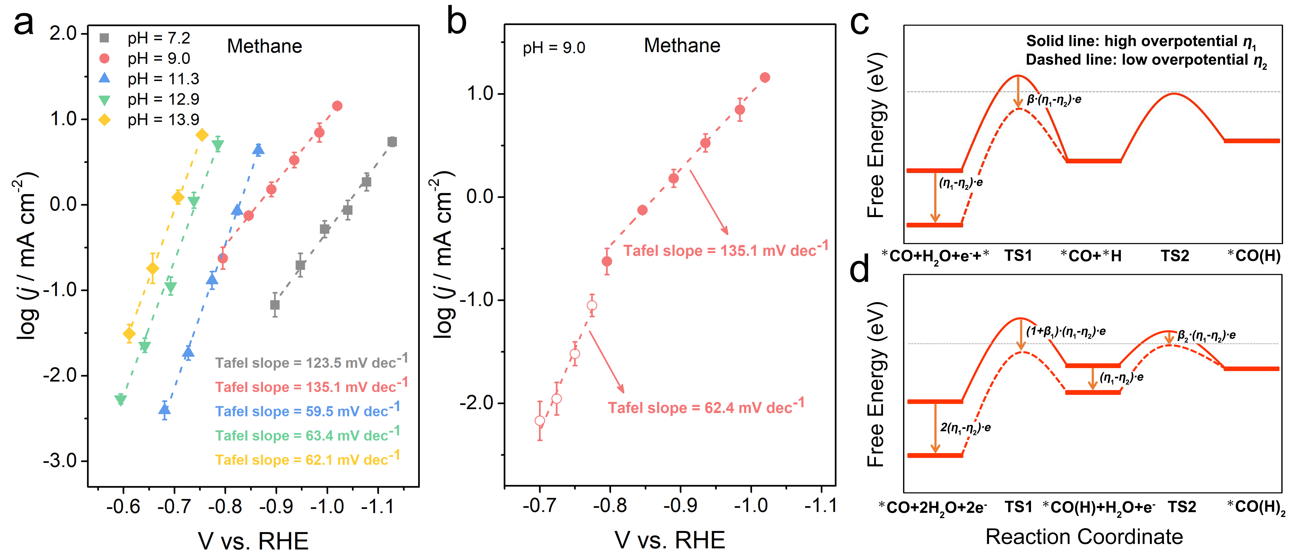 CH4在不同pH电解液中的Tafel曲线。(a) RHE标度下CH4分电流密度随电压的变化规律;(b) pH = 9.0条件下CH4的Tafel斜率随电压的变化规律;(c, d) CH4生成的决速步示意图。