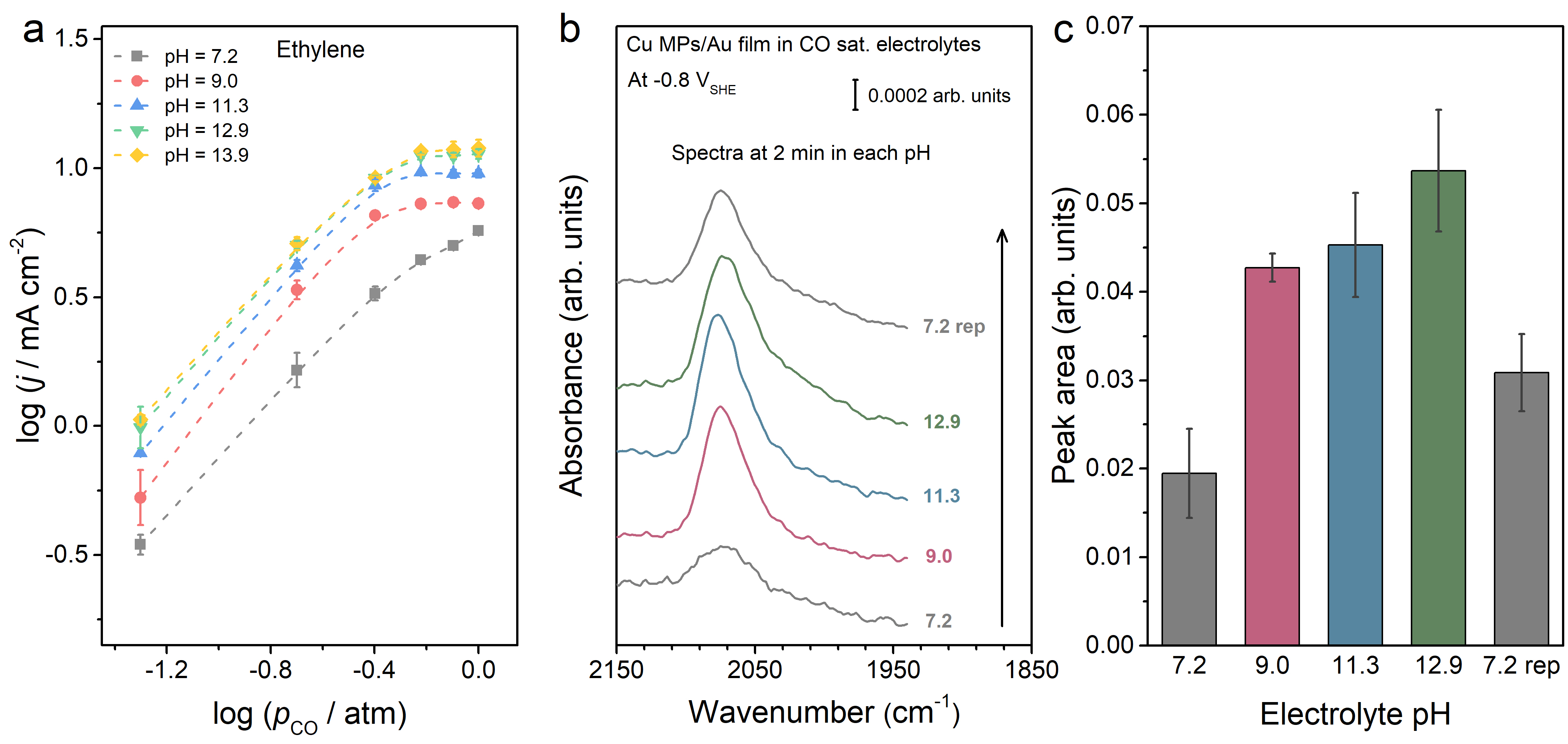 不同pH下C2+产物的CO分压依赖性实验和光谱研究。(a) 乙烯的反应速率随电压变化规律;(b) 原位红外光谱观测Cu表面的CO覆盖度随电解液pH变化规律;(c) CO吸附峰的积分面积。
