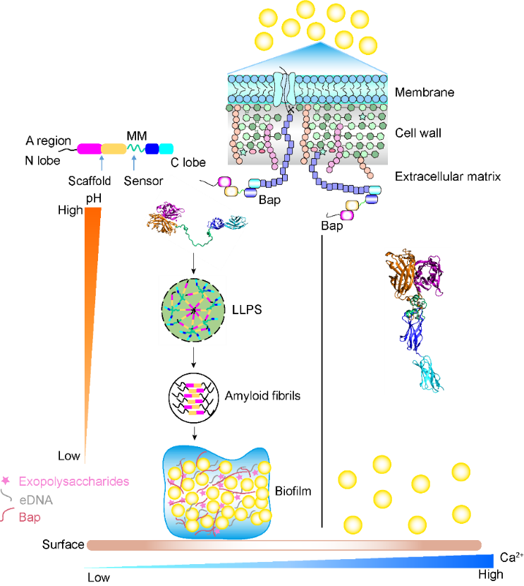 8xbet(中国)网6月3日电 近年来,由多重耐药性金黄色葡萄球菌引起的院内感染已对全人类的健康构成极大威胁。全球每年有近100万人死于无法用传统抗生素治疗的细菌感染,其中,耐甲氧西林金黄色葡萄球菌造成的死亡病例远超过由艾滋病和肺结核引起的死亡病例总和。金黄色葡萄球菌的耐药性往往与其能形成生物被膜密切相关。人们很早就在奶牛源金黄色葡萄球菌中发现一种被称作生物被膜相关蛋白(Biofilm associated proteins)的细胞表面蛋白Bap,Bap在介导葡萄球菌生物被膜的形成中发挥重要作用。Bap是一个多结构域蛋白,全长蛋白含有2276个氨基酸。最近的研究表明,Bap蛋白的N末端在低pH和低钙下易于聚集形成功能性淀粉样纤维,并且促进细菌聚集和生物被膜的形成。然而,Bap蛋白响应环境变化调控淀粉样纤维的形成以及介导生物被膜形成的机制并不清楚。