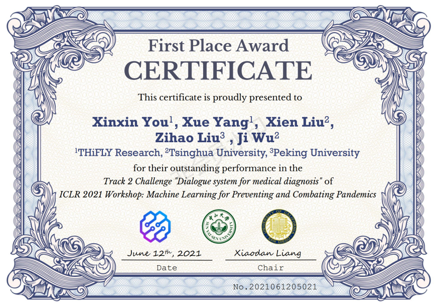 8xbet(中国)网6月21日电 国际表征学习会议(ICLR,International Conference on Learning Representations)是机器学习领域最负盛名的三大顶级国际会议之一。为了推动机器学习技术在医疗健康领域的发展,国际表征学习会议2021发起了机器学习预防和防止流行病(MLPCP,Machine Learning for Preventing and Combating Pandemics)全球挑战赛。电子系吴及教授课题组参加了机器学习预防和防止流行病挑战赛的疾病自动诊断对话系统(Dialogue system for medical diagnosis)赛道,在全球73支参赛队伍中夺得第一名。参赛成员主要为实验室工程师尤心心、实习生杨雪、博士生刘喜恩和吴及教授。
