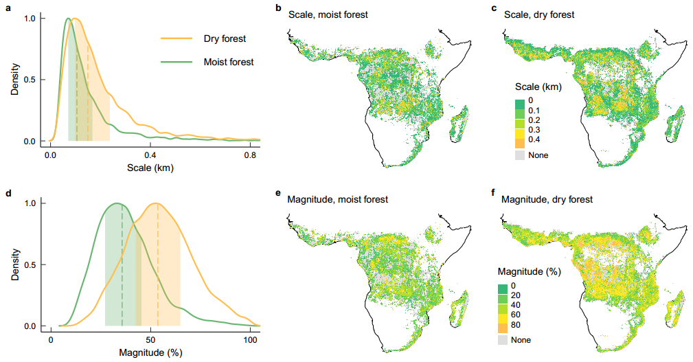 图1 非洲地区森林边缘效应的尺度(scale)和强度(magnitude)。(a)尺度和(d)强度的频率分布。
