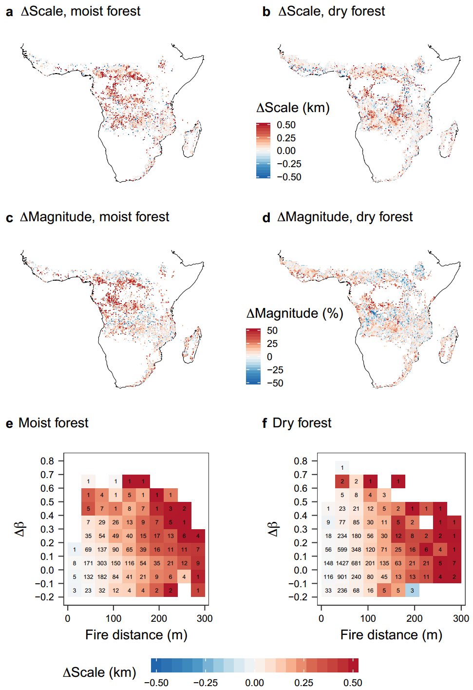 (e, f)尺度差异(Δscale)与波文比差异(Δβ)、火灾距离(fire distance)的关系。