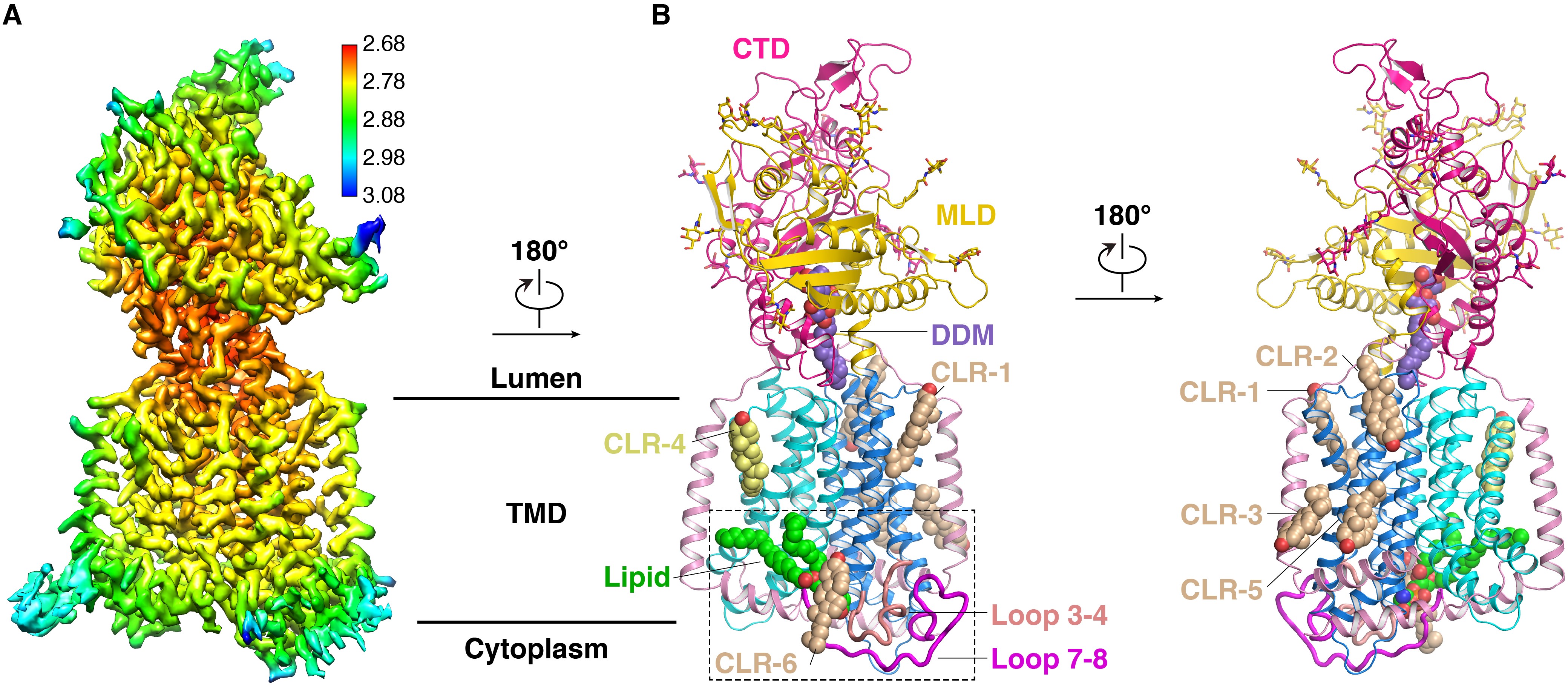 图1:NPC1L1在胆固醇富集状态下的结构。A 冷冻电子密度图。B 原子模型。虚线方框所示为由胆固醇分子、磷脂小分子、胞内Loop 3-4 及 Loop 7-8所构成的结构簇(Cluster)。