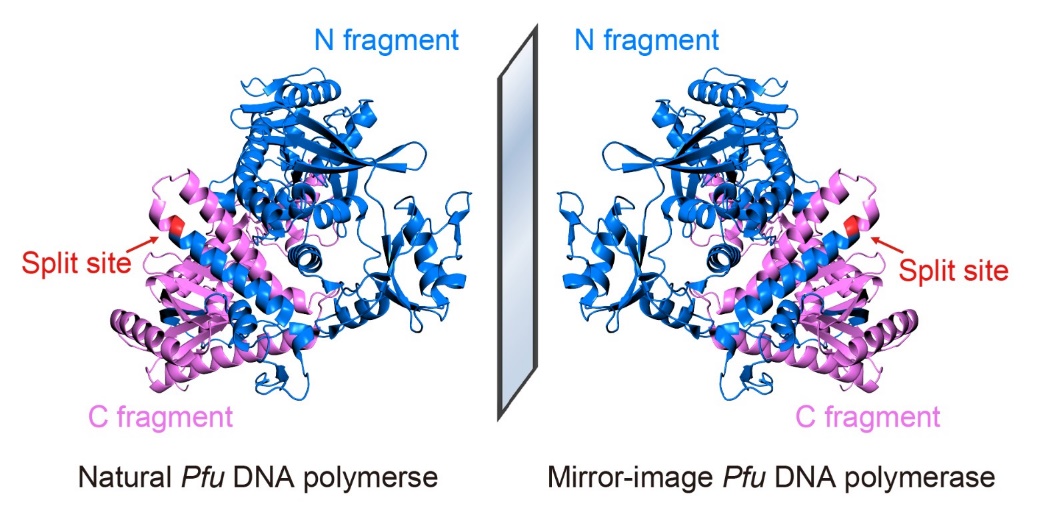 为突破全化学合成对蛋白质大小的限制,研究者提出利用分割蛋白质设计辅助合成的策略,将全长为775个氨基酸的PfuDNA聚合酶分割为长度为467个氨基酸和308个氨基酸的两个片段分别合成,将其混合后共同复性,使其正确折叠为具有完整功能的90 kDa高保真镜像PfuDNA聚合酶(图1),为目前已报道最大的全化学合成蛋白质;研究者还利用该高保真镜像聚合酶组装出长达1.5kb的镜像16S核糖体RNA基因,为目前已报道最长的镜像DNA。该实验中首次使用的大型镜像蛋白质全化学合成策略及千碱基长度镜像基因的组装技术,解决了长期制约镜像生物学领域发展的大型镜像生物分子的制备难题,为后续构建镜像蛋白质翻译系统以实现完整的镜像中心法则及拓展镜像生物学系统的实际应用奠定了基础。