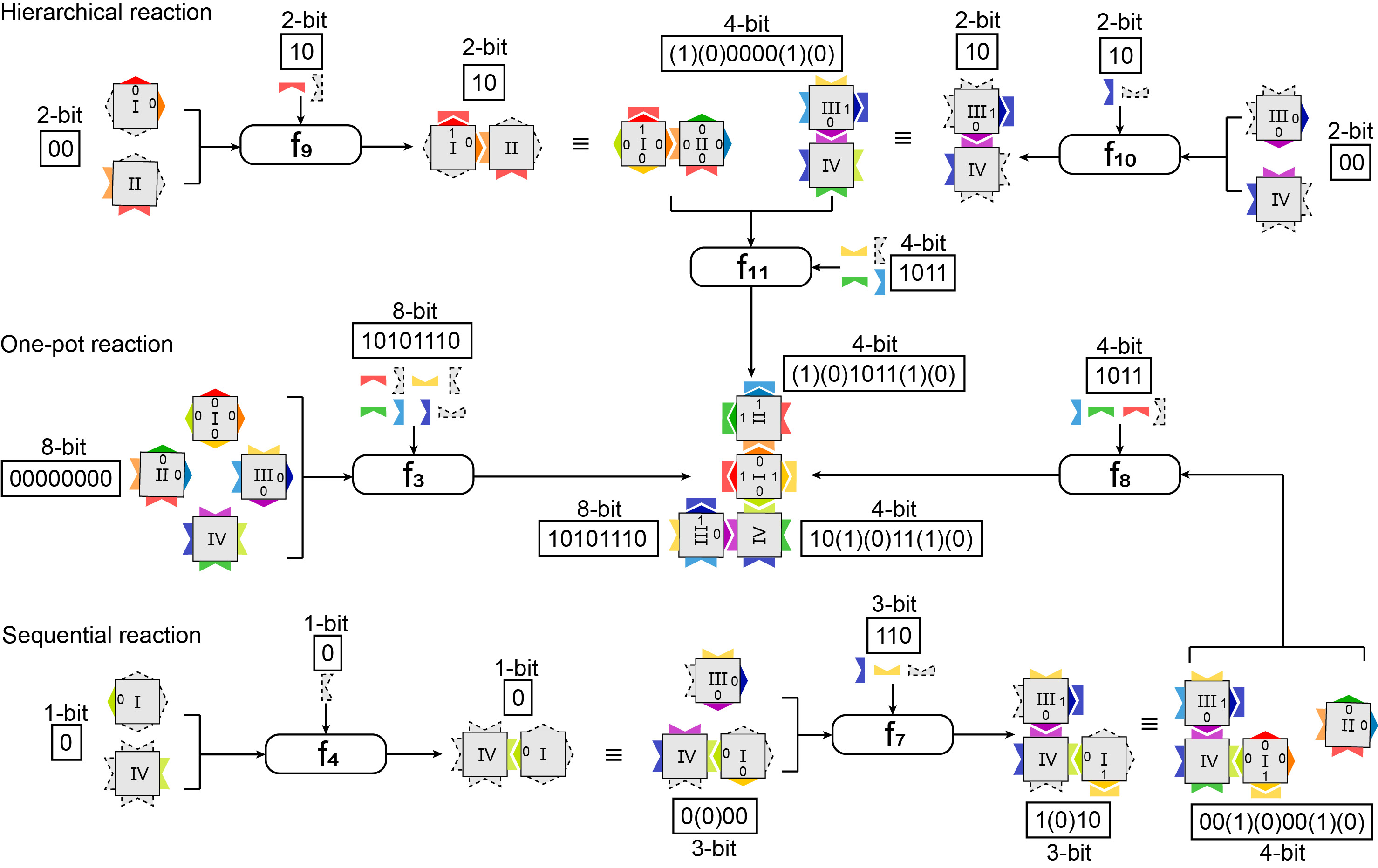 图2基于非黏性末端链置换方法控制信息计算过程。采用三种不同方式反应可以得到相同的J型四聚体俄罗斯方块。第一种是层级式反应(顶部)。两两单元之间形成二聚体,然后再形成四聚体,即两个2比特输入/2比特输出的布尔函数通过组合得到一个4比特输入/2比特输出的函数。第二中是一步法反应(中间),操作与图1所示相同,是一个16比特输入/8比特函数输出的布尔函数。第三种是顺序反应(底部),单元之间依次连接形成四聚体,是三个2比特输入/2比特输出布尔函数之间的迭代。